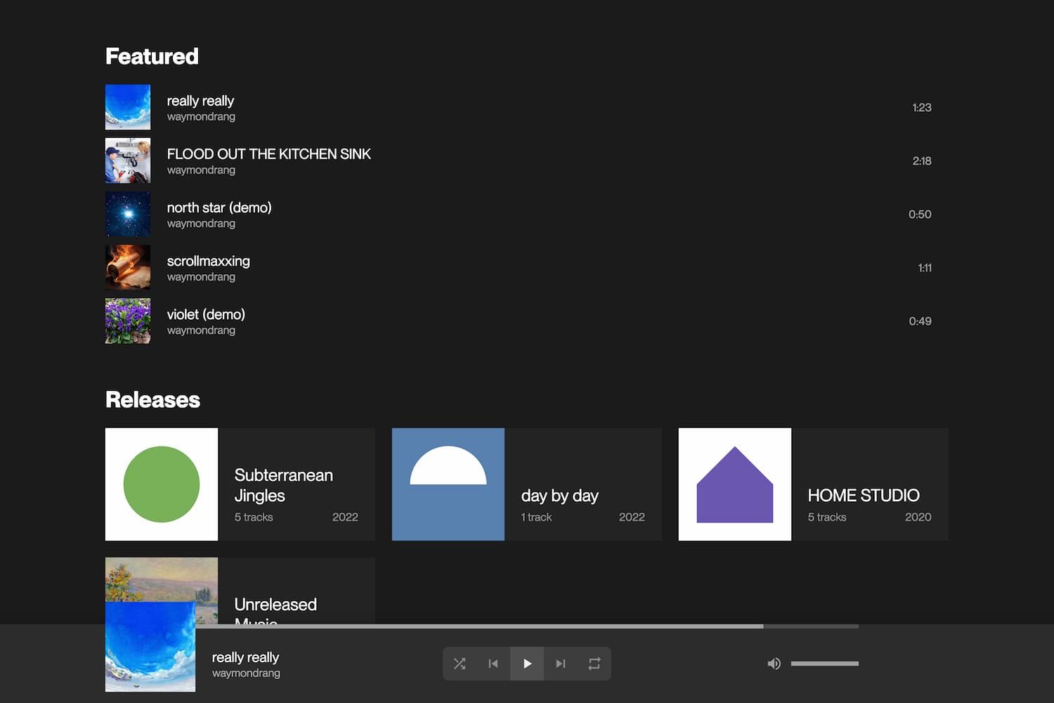 Built with Next.js and React in TypeScript, lilac delivers a familiar music streaming experience featuring custom audio playback controls, dynamic context menus, and a responsive design.
